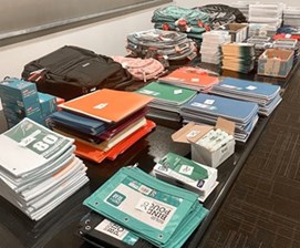 Colorful stacks of notebooks, pens, markers, flash drives and much more filled multiple conference tables before being carefully sorted and put inside backpacks.